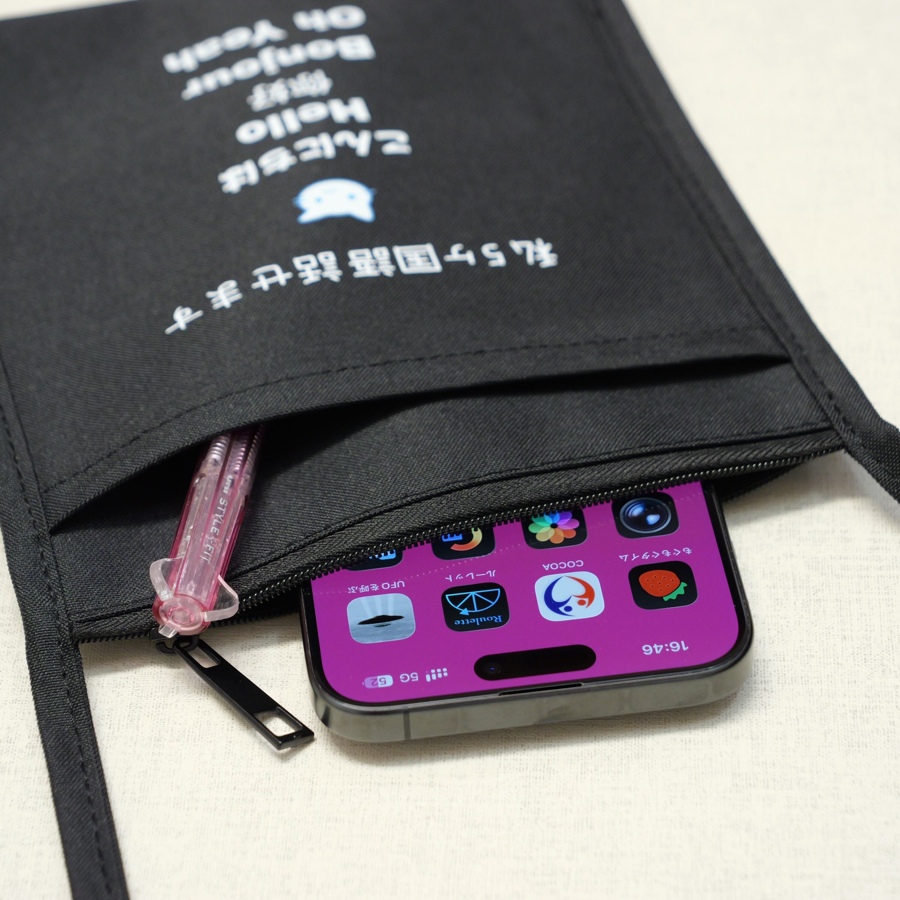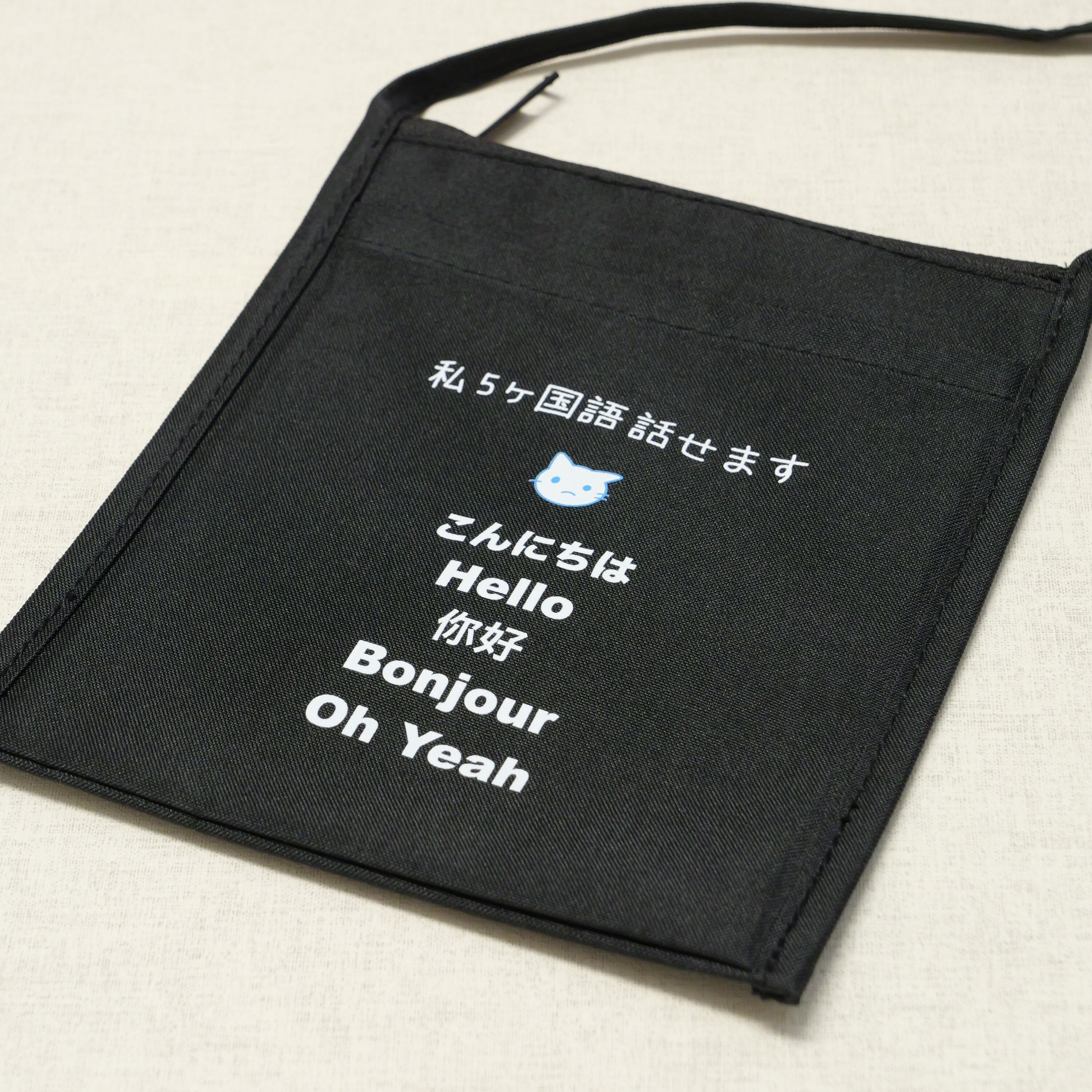 5ヶ国語の挨拶がプリントされているサコッシュです。こんにちは・Hello・你好・Bonjour・Oh Yeah